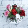 TOP ~3000円 年末年始特集 レース模様が美しい花器に、赤バラとピンクバラを6本使ったクリスマスの雰囲気たっぷりのアレンジメントです!綿の実、赤い実、松ぼっくり、、クリスマスっぽい花材が入ります。聖夜の華やかさを演出してはいかがでしょうか。テーブルに飾れば、お部屋全体を華やかに彩り、クリスマスムード満点です。贈り物にもオススメです。花器サイズ:16.5×10.5×H6cm花器材質:ブリキ・ウッド 2022Xmas生花アレンジ3000円◆送料込み! 価格: ¥3,000 (税込) 販売期間: 数量: 個 在庫: 在庫あり 在庫 在庫あり 返品についての詳細はこちらをご覧ください