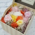 可愛らしい紙箱に、薔薇のプリザーブドフラワーと、周りにアジサイ、カスミソウのプリザーブドフラワーなどが入ったデザインです。
