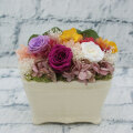 W10cmD6cmH6.5cmの陶器に、バラのプリザーブドフラワーと様々な花材が入ったデザインです。