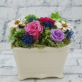 W10cmD6cmH6.5cmの陶器に、バラのプリザーブドフラワーと様々な花材が入ったデザインです。