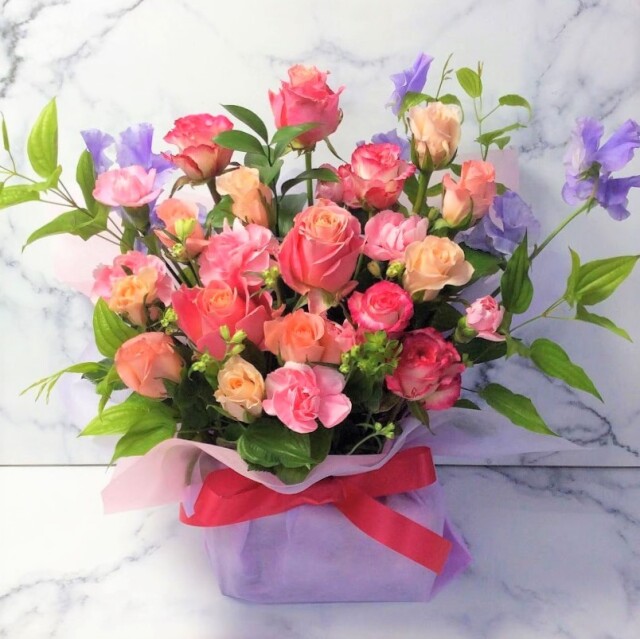バラの長さ50~60cm。すべてオリジナルのアレンジですのでご注文時に、用途などをお伝えいただければそれに合わせてお作りいたします。バラの花1本当たりのお値段は夏場150円~300円 冬場300~500円になります。 (添え花込みのお値段です) 花の大きさ、季節、時期などにより変化します。