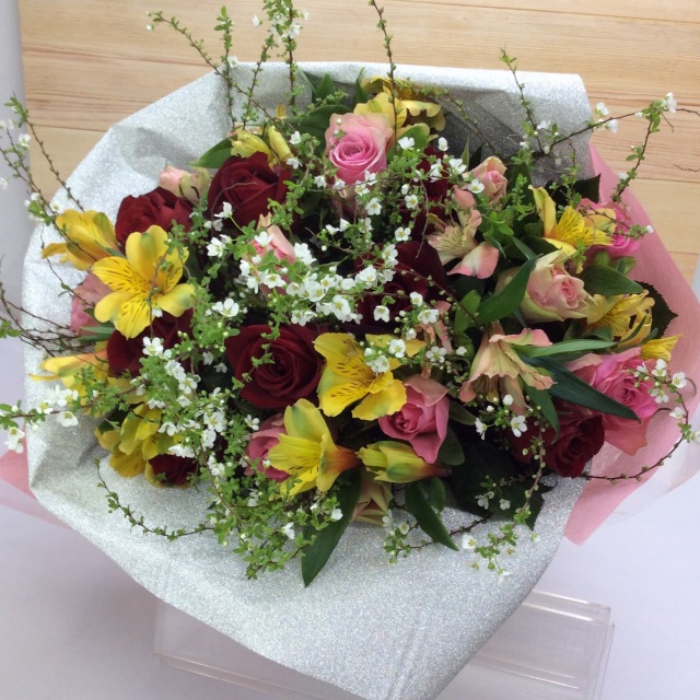 50~60cmのバラを使った、丈のある花束です。送別会や、記念日、お礼、などに喜ばれています。